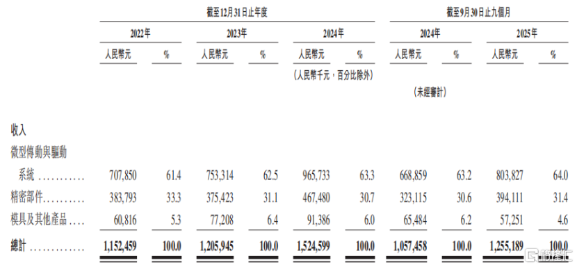 2024年,公司来自微型传动与驱动系统的收入为9.66亿元,占比为63.3%,来自精密部件的收入为4.67亿元,占比为30.7%;其余还有少部分收入来自模具产品。