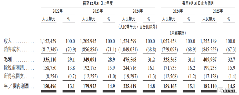 2022年、2023年、2024年及2025年1-9月(报告期),公司的收入分别为11.52亿元、12.06亿元、15.25亿元、12.55亿元,净利润分别为1.5亿元、1.8亿元、2.25亿元、1.82亿元。