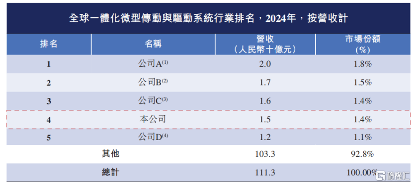 按2024年收入计,兆威机电是中国最大的一体化微型传动与驱动系统产品提供商,是全球第四大一体化微型传动与驱动系统产品提供商,市场份额分别为3.9%及1.4%。