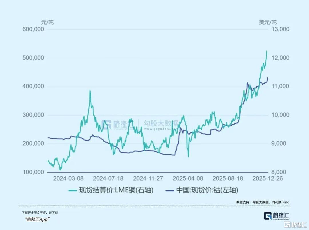 供需格局更是锦上添花。2025年伦铜价突破1.2万美元/吨,沪铜期货站上10万元/吨;钴价从年初16.9万元/吨飙升至43万元/吨以上,涨幅超154%。供给端,铜矿长期资本开支不足导致供给刚性,刚果(金)作为全球76%钴产量的来源地,2025年10月起执行出口配额制,2026-2027年配额仅为2024年产量的4-5成,直接推动钴价中枢持续抬升。