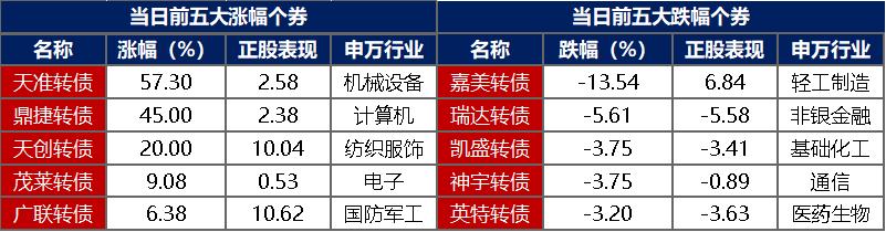 【转债市场主要指数涨跌不一】 12月31日,转债市场跟随权益市场窄幅震荡,中证转债、上证转债分别收涨0.02%、0.08%,深证转债收跌0.09%。转债市场成交额818.90亿元,较前一交易日缩量11.63亿元。转债市场个券多数上涨,390支转债中,236支收涨,140支下跌,14支持平。当日上涨个券中,新上市天准转债涨停57.3%,鼎捷转债涨超45%,领涨市场,存量个券中,天创转债继续涨停20%;下跌个券中,嘉美转债跌逾13%,瑞达转债跌逾5%。
