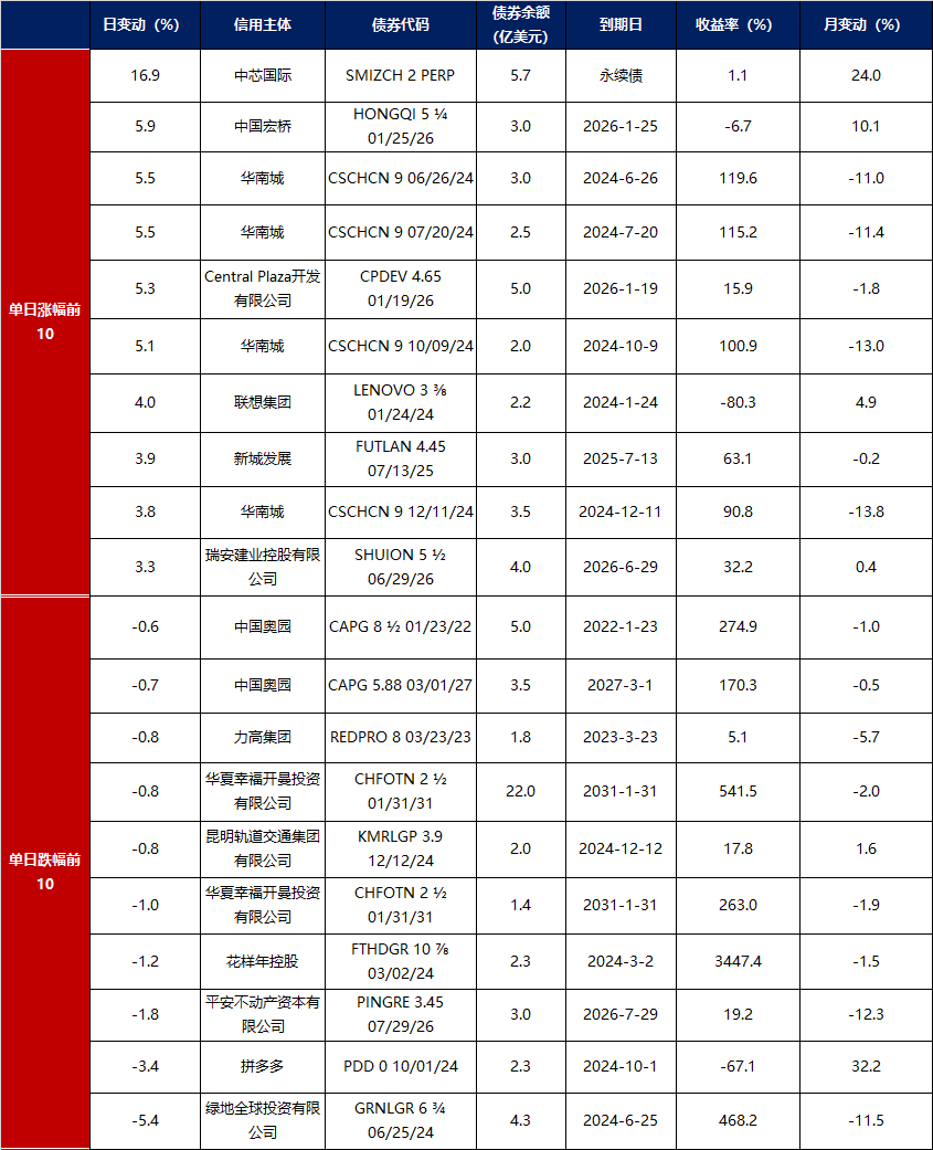 12月31日,4只产业债成交价格偏离幅度超10%,为“23产融09”跌超15%;“22万科04”涨超13%,“22万科06”涨超14%,“22万科02”涨超14%。