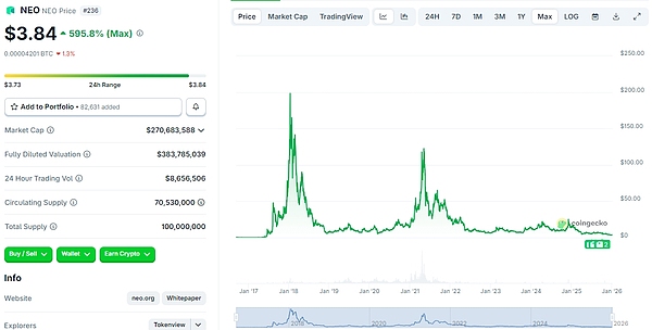 2018年1月,NEO价格曾最高涨至200美元的历史高点,可谓一度风光无限。但八年之后的1月,NEO价格仅为3.84美元,今昔对比之下,NEO给人一种苦苦支撑之感。
