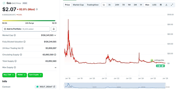 2018年1月,GAS价格最高飙升至将近100美元,但截至发稿,仅为2.07美元。据CoinGecko数据显示,GAS价格已经较之历史高点暴跌了92%。