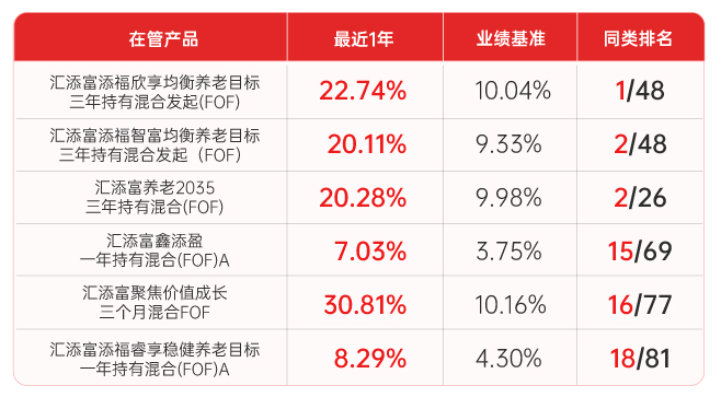 数据来源:业绩经托管行复核,基准来自汇添富,同类排名来自银河证券公募基金长期业绩榜单,统计区间2024/12/1-2025/11/30。表格所示排名类型依次为养老目标风险FOF(权益资产30%-60%)(A类)、养老目标风险FOF(权益资产30%-60%)(A类)、养老目标日期FOF(2035)(A类)、混合型FOF(权益资产0-30%)(A类)、混合型FOF(权益资产60%-95%)(A类)、养老目标风险FOF(权益资产0-30%)(A类)。各年度完整业绩见文末,基金过往业绩并不预示其未来表现,基金管理人管理的其他基金的业绩并不构成未来本基金业绩表现的保证。
