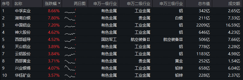 成份股方面,中孚实业领涨超8%,湖南白银、中国铝业涨逾7%,神火股份、西部超导涨超4%,天山铝业、云铝股份、西部黄金等个股跟涨。权重股方面,紫金矿业、洛阳钼业、山东黄金、北方稀土涨逾1%。