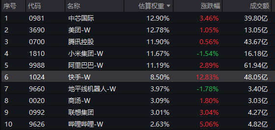 港股科技热门股中,快手-W飙涨超12%,中芯国际涨超3%,阿里巴巴-W涨超2%,美团-W、商汤-W涨超1%,腾讯控股微涨。