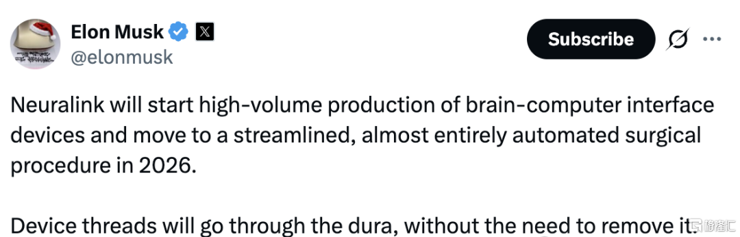 美国企业家埃隆·马斯克2025年12月31日在社交媒体X上宣布,Neuralink今年将开启“大规模量产”,手术流程转向精简、自动化,线体插入时间缩短至1.5秒,针筒的制造成本更是降低了95%。