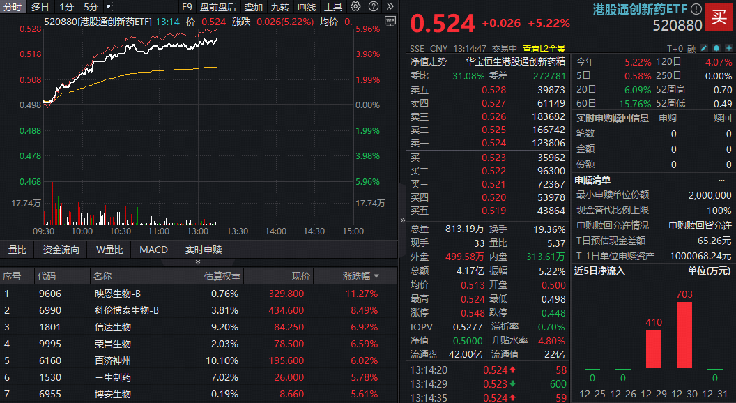1月5日午后,港股通创新药板块维持强势,创新药纯度100%的港股通创新药ETF(520880)弹性十足,放量大涨5.22%!场内快速成交4亿元,较前一交易日放量近200%!