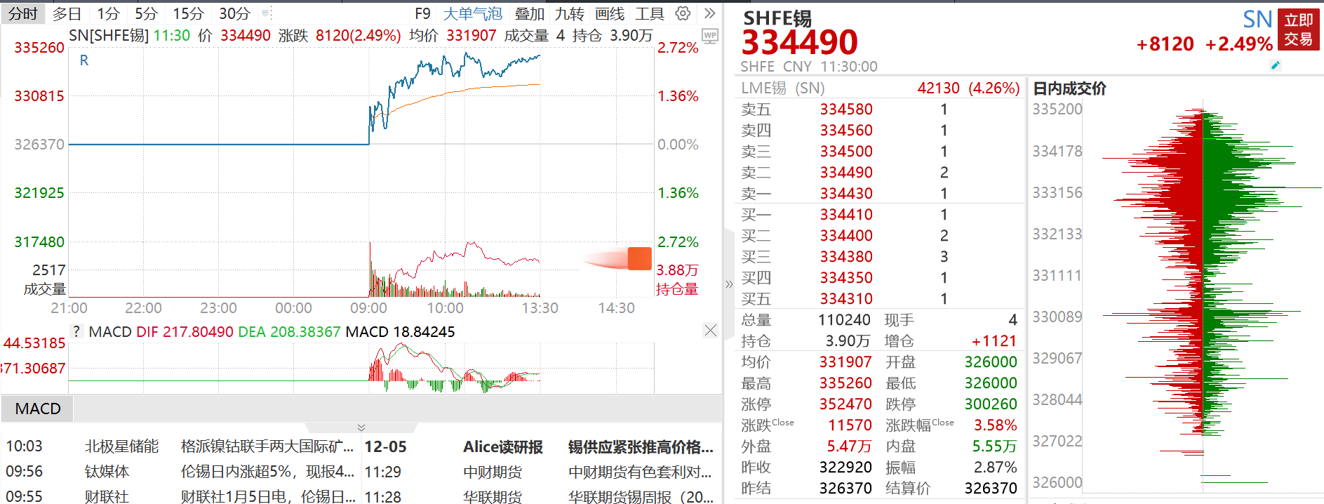 消息面,国内锡价强势高开,据长江有色金属网获悉,锡早盘均价触及333750元/吨,单日涨幅显著,较前一个交易日上涨7750元,与期货同步刷新近期高点,成为有色金属板块中备受关注的品种。