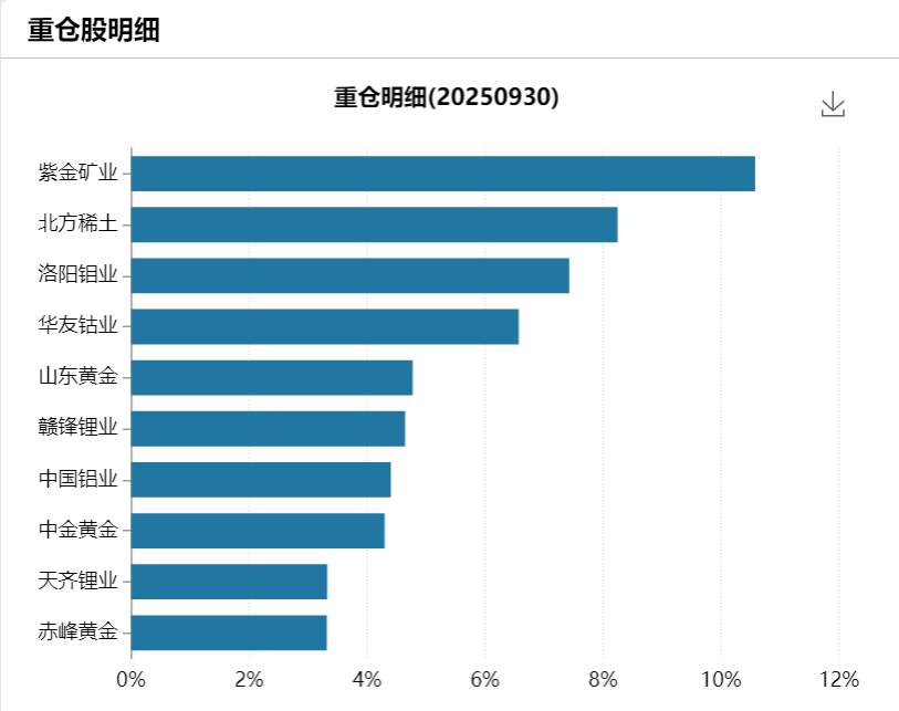 资源巨头领衔:第一大重仓股为紫金矿业(约10.4%),紧随其后的是北方稀土(8.1%)和洛阳钼业(7.3%)。