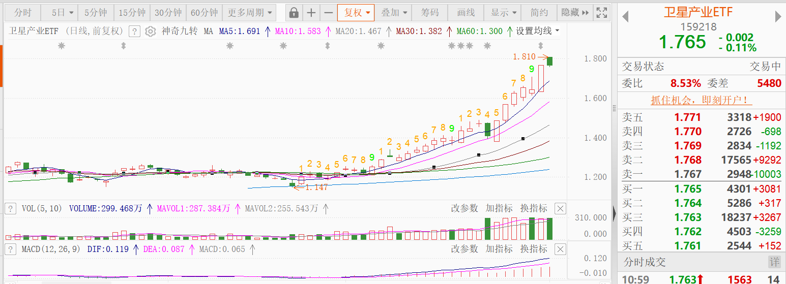 开年第一个交易日,全球资本市场开启了新年狂欢,上证指数也在早盘成功突破4000点。作为市场的强势主线之一,卫星产业ETF看盘延续强势,但受止盈盘抛售,高开回落,临近午盘翻绿。