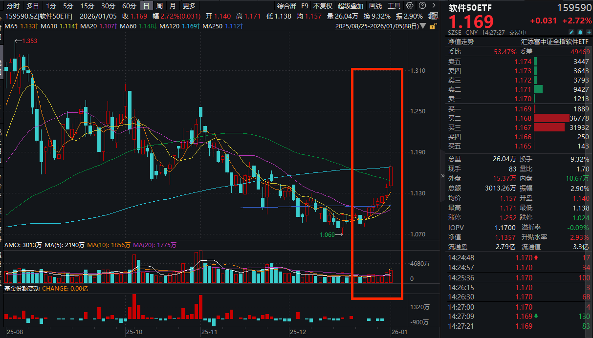今日(1.5),AI应用午后走强,信创50ETF(560850)涨超3%强势冲击三连阳,成交额再度放量!软件50ETF(159590)亦涨近3%,自2025年12月24日以来,强势冲击七连阳!