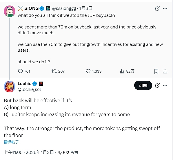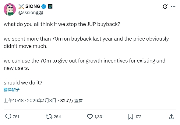 2026年1月3日,Jupiter联合创始人Siong Ong在推特上询问“大家觉得我们停止JUP回购怎么样?去年我们花了7000多万美元回购,但价格显然没有太大变化。我们可以把这7000万美元用来奖励现有用户和新用户,促进增长。我们应该这么做吗?”