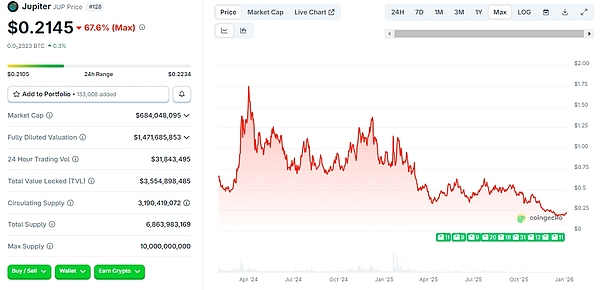 尽管做出了这些努力,JUP 代币的价格仍比其历史最高点2024年4月时的超1.75美元跌了约 87.74%,据CoinGecko数据显示,JUP 价格现报0.2145美元。