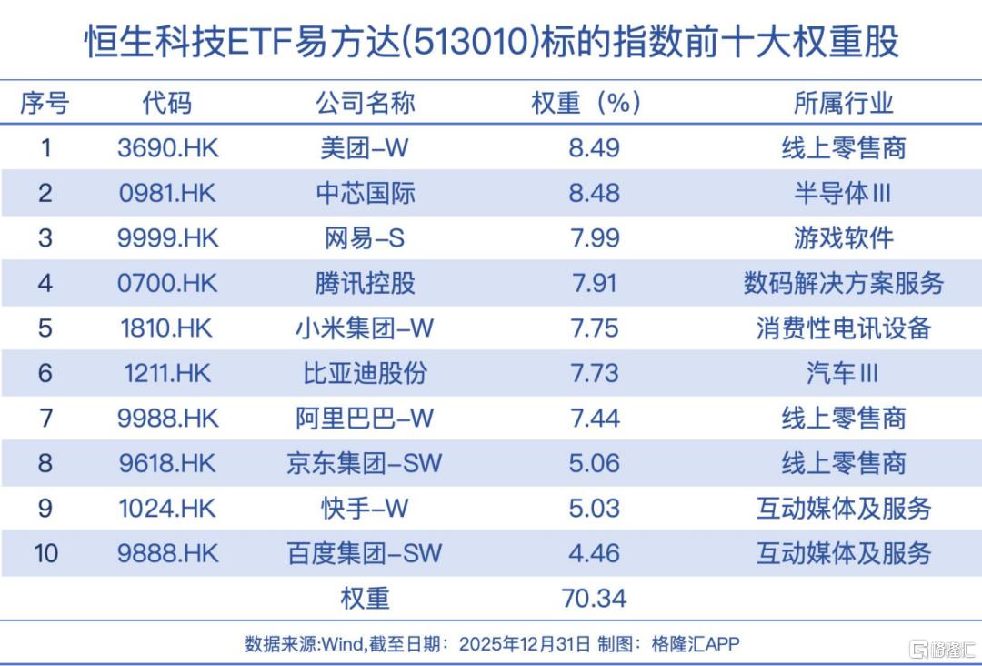 如恒生科技ETF易方达(513010),一键打包中国科技核心资产,聚焦AI产业链的上中下游,成份股囊括腾讯控股、阿里、美团、快手、百度等科技巨头。
