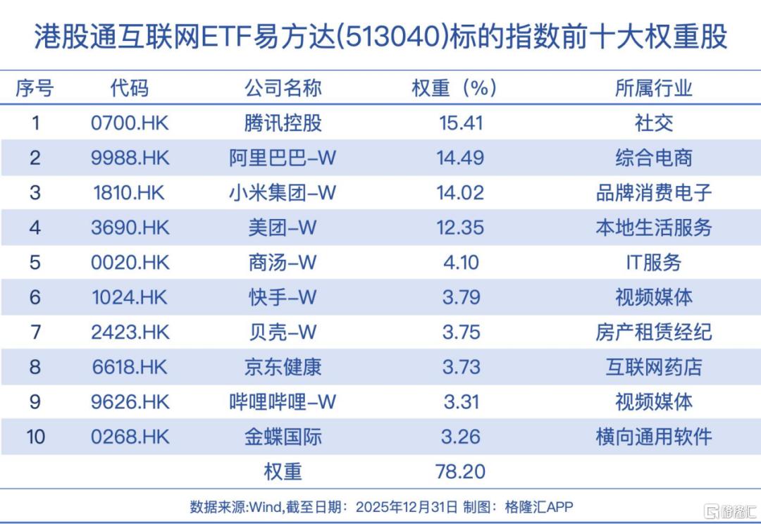 又如港股通互联网ETF易方达(513040),聚焦互联网平台经济,涵盖腾讯、阿里、小米、美团等大型互联网公司,前四大成份股占比超56%,锐度高,弹性大。