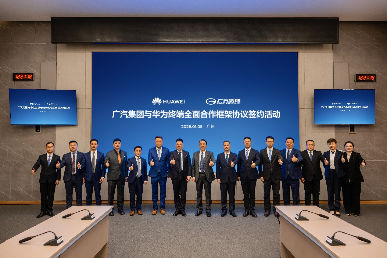 2026年1月5日,华为常务董事、产品投资评审委员会主任、终端BG董事长余承东一行到访广汽集团番禺总部。广汽集团董事长冯兴亚、总经理閤先庆等出席接待。期间,在冯兴亚、閤先庆、余承东以及华为终端云服务总裁朱勇刚的共同见证下,广汽集团平台技术研究院院长梁伟强、华为终端云服务全球生态与销售部总裁宁胜蓝代表双方签署了广汽集团与华为终端全面合作框架协议。