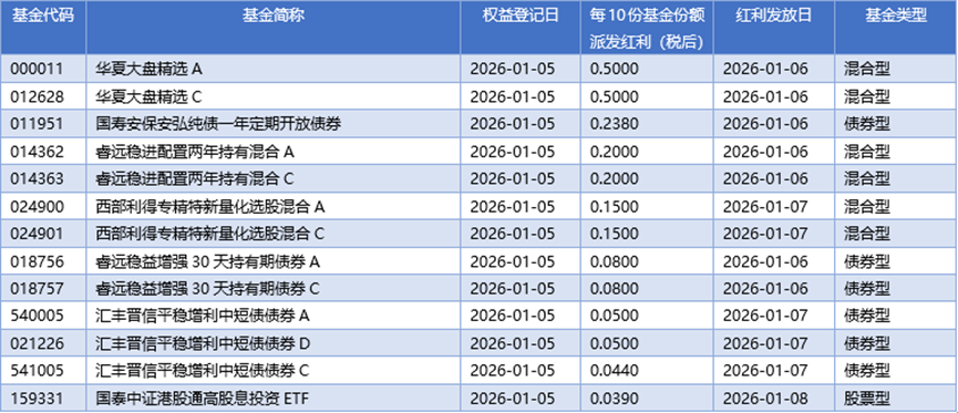 四、01月05日基金分红一览
