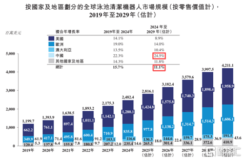 从行业视角看,全球泳池清洁机器人市场规模持续扩大,中国市场的增长潜力更为突出。据灼识咨询,全球泳池清洁机器人市场规模由2019年的12亿美元增至2024年的24.8亿美元,年复合增长率约15.7%;预计2024至2029年仍将保持11.1%的增速水平。其中,中国市场增速尤为亮眼,未来五年CAGR预计达24.5%,显著高于全球平均水平。