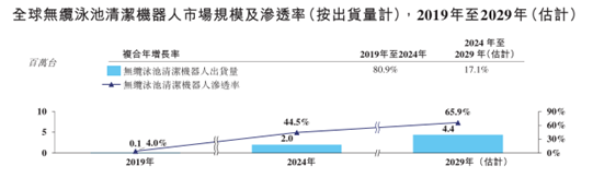 灼识咨询预计,全球无缆泳池清洁机器人出货量将持续保持高速增长,预计到2029年将达到440 万台,2024至2029年CAGR达17.1%;相较之下,有缆产品在替代效应推动下或将进入负增长区间。