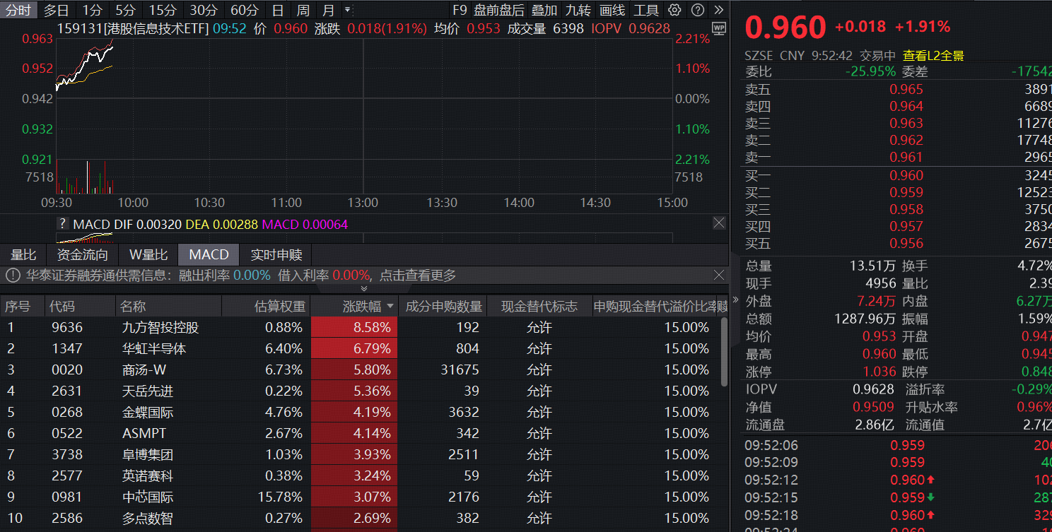 ETF盘中资讯|中芯国际、华虹半导体双双大涨刷新近2月阶段新高!港股信息技术ETF(159131)高开高走涨近2%