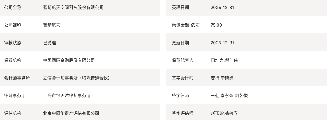 2025年12月31日,上交所官网显示,蓝箭航天空间科技股份有限公司(以下简称“蓝箭航天”)IPO上市申请已经被受理;2026年1月5日,中证协发布“2026年第一批首发企业现场检查抽查名单”,蓝箭航天被抽中现场检查。