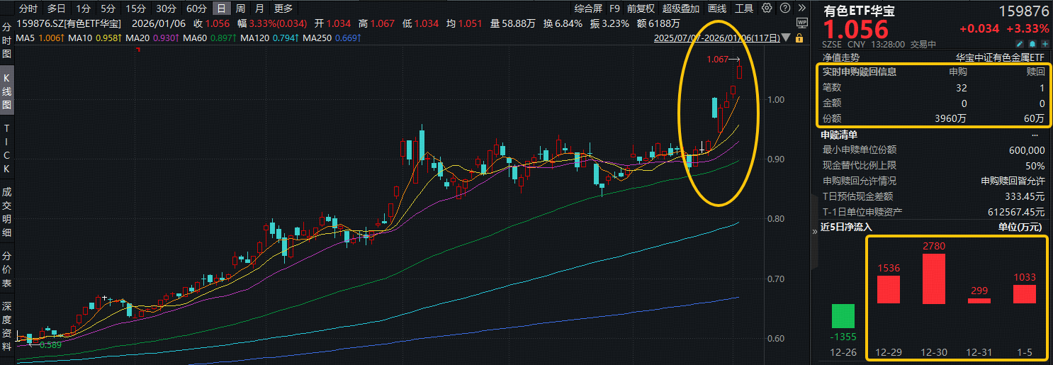 ETF放量突破上市高点,或为资金买点信号!截至发稿,有色ETF华宝(159876)获资金实时净申购3900万份,此前4日连续获资金净流入,合计金额5648万元,伴随火热的行情,资金正在积极进场抢筹!