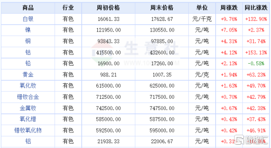 不仅期货和股票市场的有色品种在上涨,现货市场同样也在持续大幅上涨。生意社行情数据显示,截至2025年第51周,镍、钴、铅、钕、铝等有色金属均环比有不同上涨,其中不少品种同比涨幅超过30%。