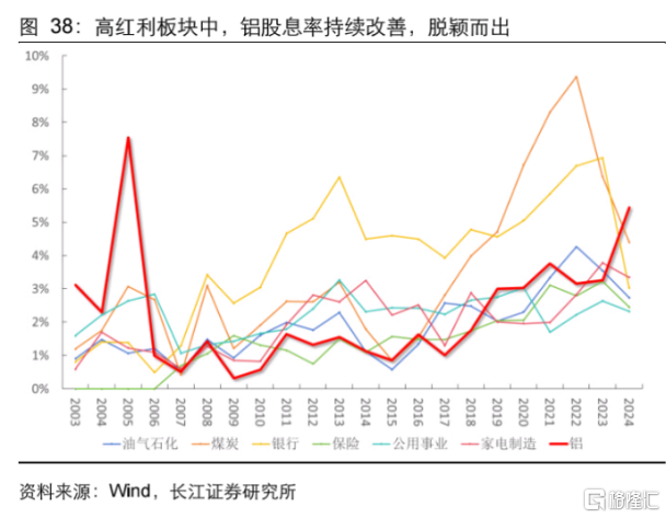 因为在众多资金重点关注的高息股资产中,铝行业的股息率是近几年除煤炭外最为明显和稳改善的行业,尤其2023年之后的改善速度在进一步加速,而对比油气、保险、公用事业、家电等行业反而出现了回落,双方平均股息率差价超过2个百分点。