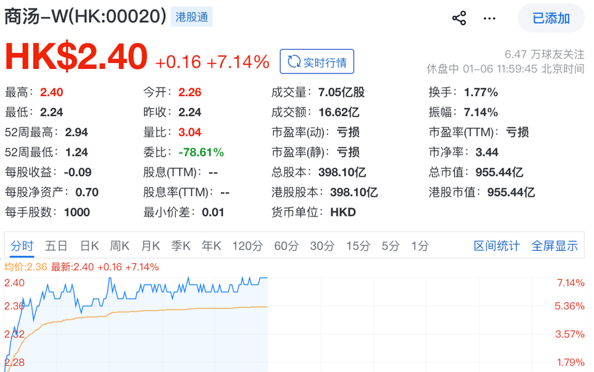 1月6日,商汤科技股价迎来强势拉升,盘中最高触及2.40港元,涨幅达7.14%,截至午盘休市报2.40港元,成交额16.62亿港元,成交量7.05亿股。
