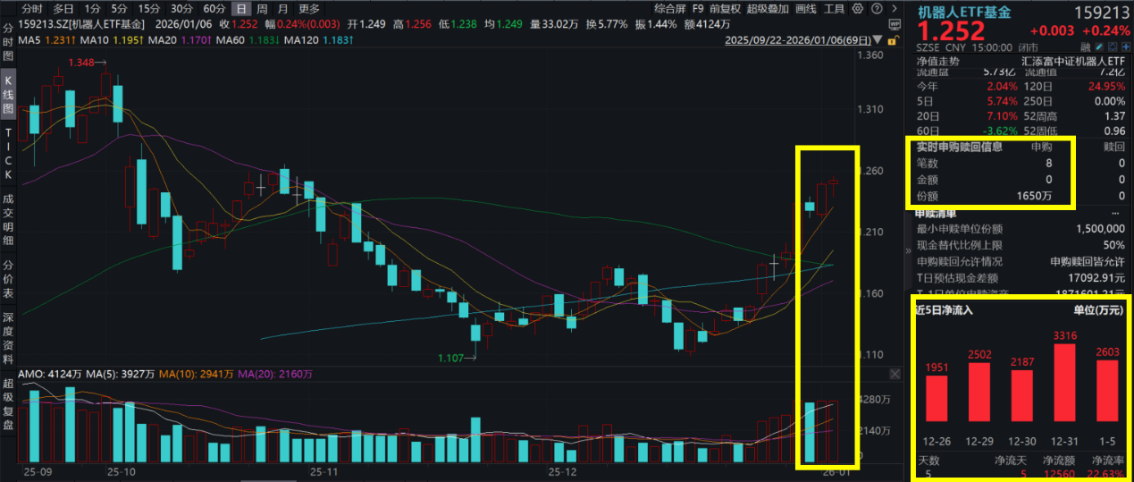 1月6日,A股市场震荡上行,开门红行情继续火爆,沪指涨超1%喜提13连阳,再创十年新高!机器人ETF基金(159213)微涨0.24%,喜提2连阳!资金持续汹涌涌入,机器人ETF基金(159213)全天吸金超2000万元,已连续6日强势吸金超1.46亿元。