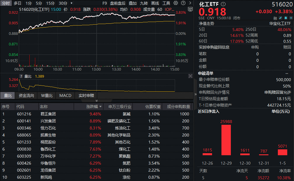 化工板块场内热门布局工具化工ETF(516020)亦持续吸金。交易所数据显示,截至昨日(1月5日),化工ETF(516020)近5个交易日合计获资金净申购额高达3.52亿元。