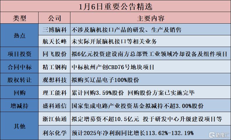 公告精选︱同飞股份:拟6亿元投资建设南方总部暨工业领域冷却设备及组件项目;航天长峰:未实际开展脑机接口等相关业务