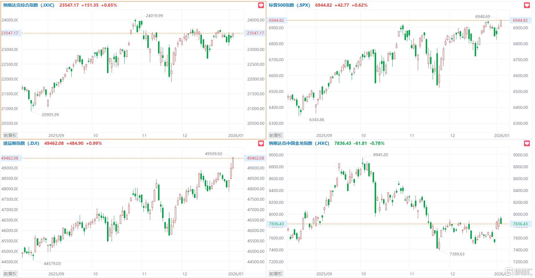1、道指、标普500指数均创新高,美光涨超10%,中概指数跌0.78%;
