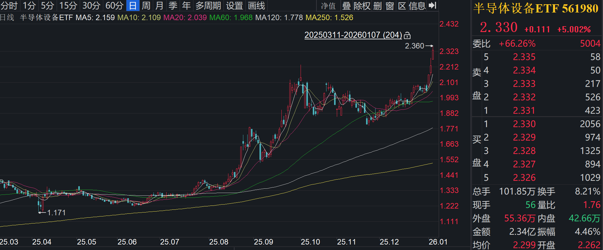 上午半导体设备ETF(561980)一度飙涨6%,2026年不到3个交易日涨超14%,直接领先A股多个行业。目前ETF前两大权重股中微公司、北方华创均已刷新历史新高,半导体设备ETF(561980)本身净值也接连2个交易日刷新上市新高,板块势不可挡的意味很强。