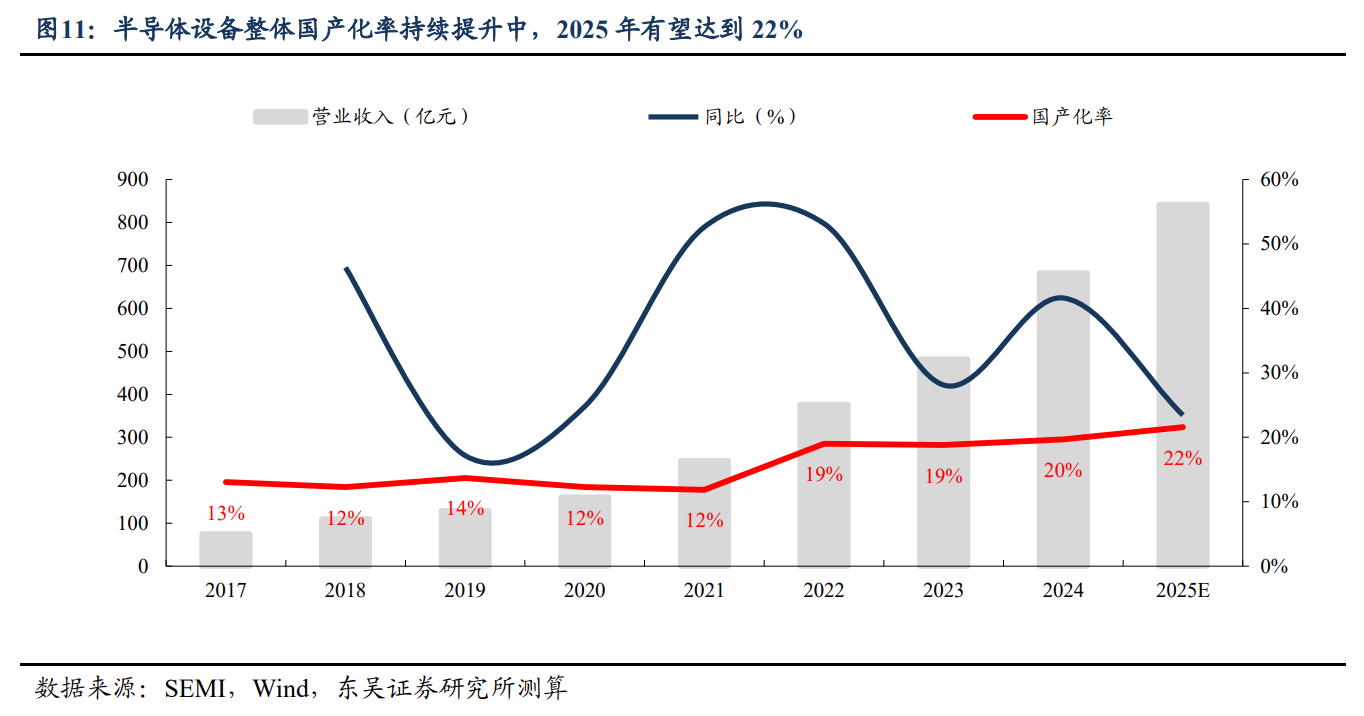 另一方面,在外部供应链限制不断收紧的背景下,半导体设备的国产替代也在加速。东吴证券预计,2025年半导体设备整体国产化率有望提升至22%,但在光刻、薄膜沉积、量检测等高端环节,国产化率仍普遍低于25%,这意味着广阔的替代空间和明确的成长路径。