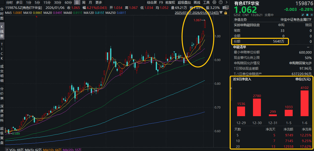 ETF盘中资讯|中方收紧稀土出口审查,中稀有色涨停!有色ETF华宝(159876)盘中拉升1.6%续创新高!获资金净申购5640万份