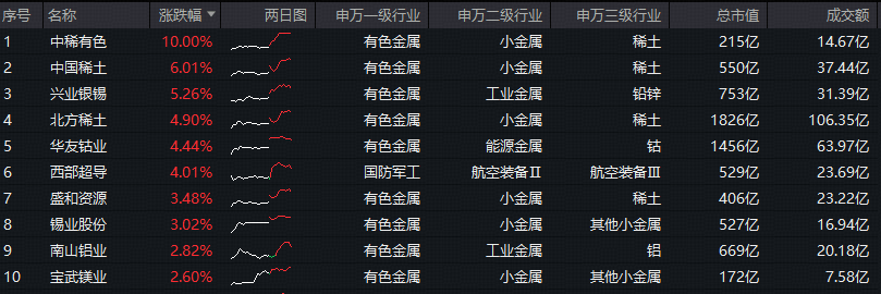 成份股方面,稀土龙头显著领涨,中稀有色涨停,中国稀土涨超6%,北方稀土涨逾4%,盛和资源涨超3%。此外,兴业银锡涨超5%,华友钴业、西部超导涨逾4%,锡业股份、南山铝业等个股跟涨。