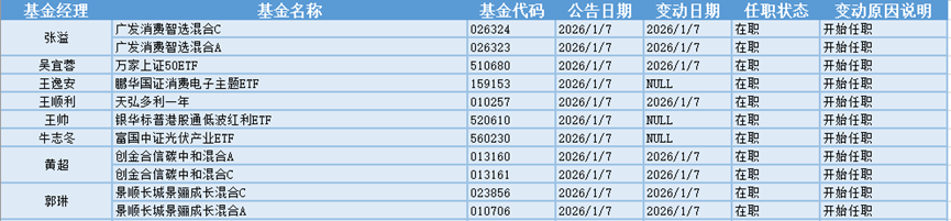 新基金经理上任方面,其中今天1.7日有11只基金产品发布基金经理任职公告,涉及8名基金经理。富国基金牛志冬现任基金资产总规模为248.03亿元,管理过的基金多为指数型和混合型基金,任职期间回报最高的产品是富国中证高端制造指数增强型(LOF)A(161037),为指数型基金,在任职的8年又168天时间内获得137.93%的回报,至今仍在管理该基金。牛志冬新任富国中证光伏产业ETF这只基金产品的基金经理。