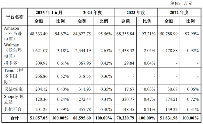 从销售渠道看,境外线上收入占外销收入的比例始终保持在五成以上。具体来看,公司主要通过Amazon、Walmart、Temu及Rakuten等跨境电商平台进行直接销售,而亚马逊平台的销售表现尤为突出。数据显示,公司通过亚马逊电商取得的销售收入分别为5.08亿元、6.83亿元、8.46亿元及4.83亿元,占据了公司境外销售收入的半壁江山。