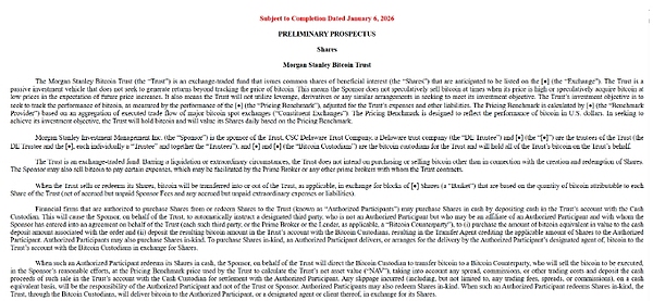2026年1月6日,美国投资银行摩根士丹利向美国证券交易委员会提交申请,拟推出两只加密货币交易所交易基金,一只与比特币挂钩,另一只与 Solana 挂钩。华尔街公司正进一步进军受监管的数字资产产品领域。