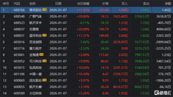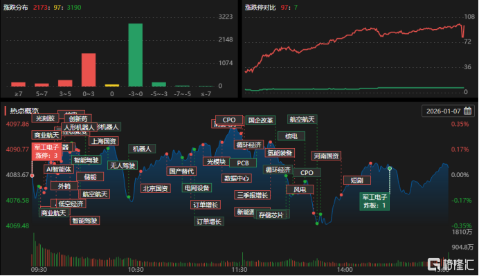 1月7日,沪深两市成交额2.85万亿,较上一个交易日放量476亿。板块方面,存储芯片、商业航天、半导体设备、光刻胶概念等板块涨幅居前,而脑机接口、钛白粉、数字货币等板块下挫。