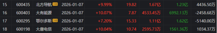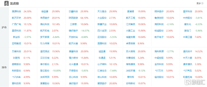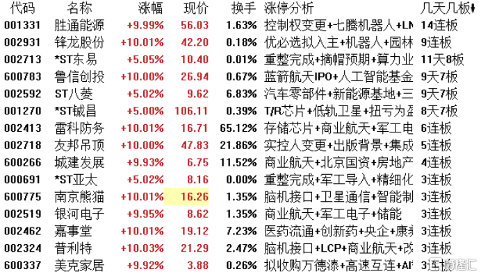高位股方面,胜通能源14连板,锋龙股份9连板,*ST东易11天8板,鲁信创投、ST八菱9天7板,*ST铖昌8天7板,雷科防务6连板,友邦吊顶5连板,城建发展4连板。