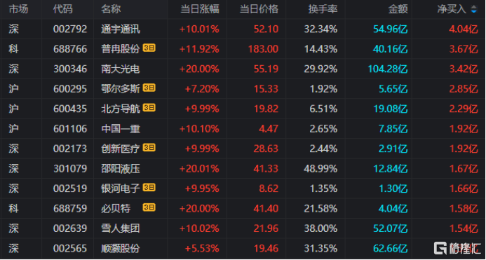 龙虎榜单日净买入额前三为通宇通讯、南大光电、中国一重,分别为4.04亿元、3.42亿元、1.92亿元。