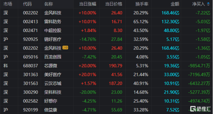 龙虎榜单日净卖出额前三为金风科技、雷科防务、中超控股,分别为7.22亿元、5.03亿元、1.97亿元。