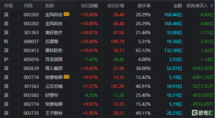 龙虎榜中涉及机构专用席位的个股中,当日净卖出额前三为金风科技、美好医疗、芯源微,分别为4.06亿元、3.71亿元、2.41亿元。