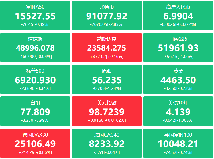 期货:现货黄金跌0.90%报4454.32美元,黄金期货跌0.73%报4463.50美元;现货白银跌3.82%报78.1530美元,白银期货跌3.81%报77.950美元;铜期货跌3.49%报5.8525美元;现货铂金跌5.86%报2303.09美元;现货钯金跌2.91%报1774.20美元;原油期货收跌2%报55.99美元,布伦特原油跌0.74美元,跌幅1.22%报59.96美元;天然气期货报3.525美元;汽油期货报1.6945美元,取暖油期货报2.0567美元。