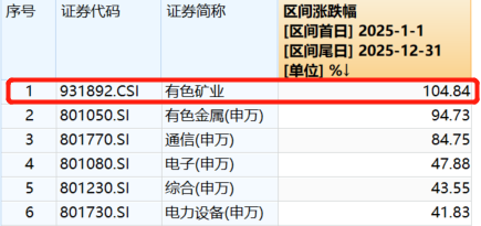 在刚刚过去的2025年,有色金属板块表现强势。有色金属板块年内涨幅94.73%,位居申万一级行业首位。有色矿业ETF招商(159690)跟踪的中证有色金属矿业指数年内涨幅达104.84%,相对弹性更佳。