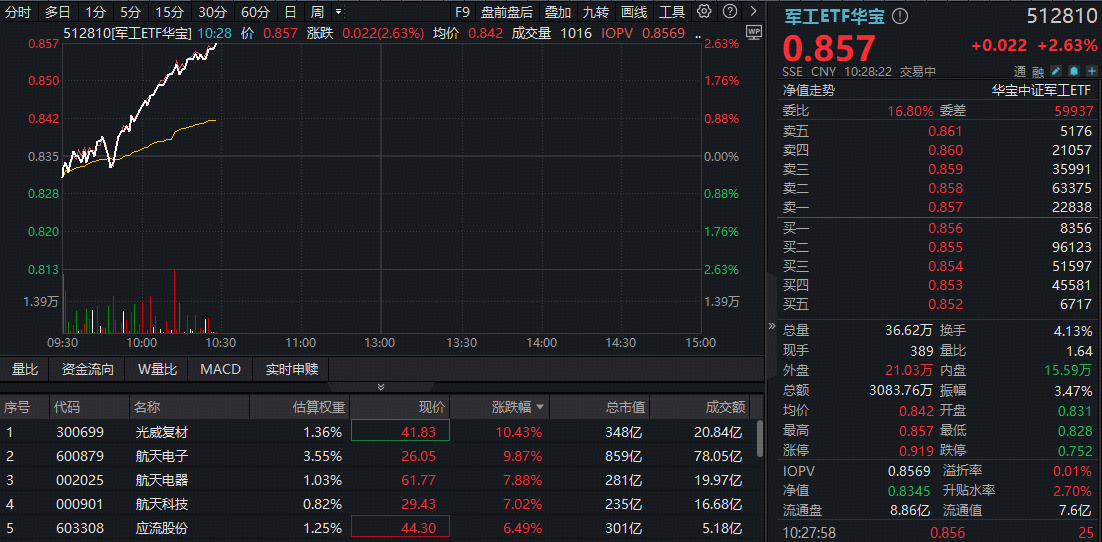 高人气军工ETF华宝(512810)火箭发射,快速冲高2.63%,场内价格连续第3日刷新历史最高纪录!